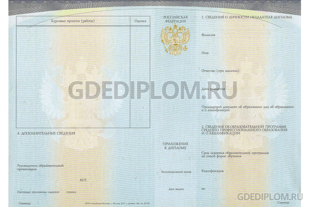 Государственное приложение к диплому о среднем образовании (техникума, колледжа) 2014, 2015, 2016, 2017, 2018, 2019 года. Изготавливается на оригинальном бланке гособразца (Гознак), заполняется по стандартам Минобрнауки и выбранного ВУЗа.